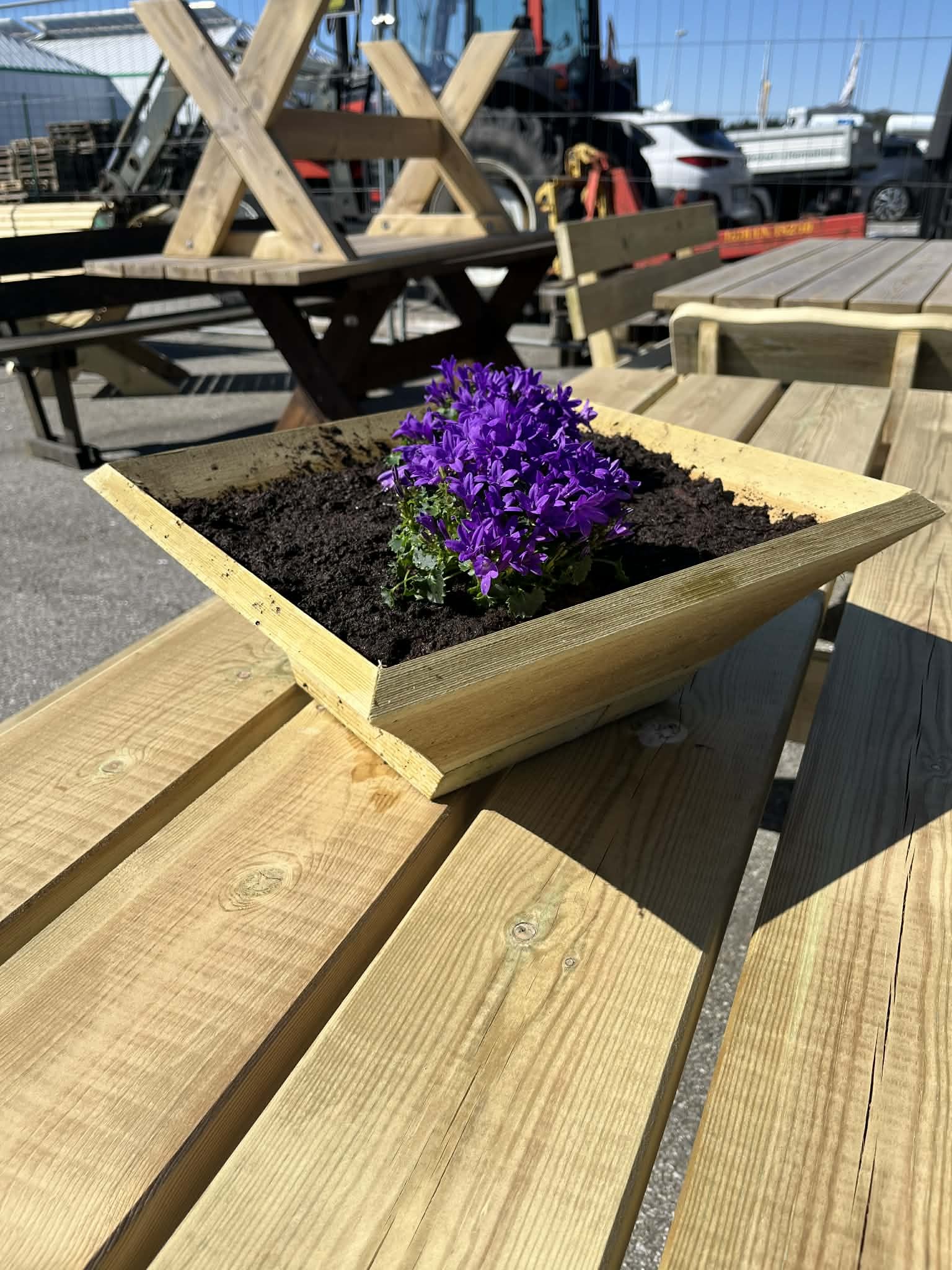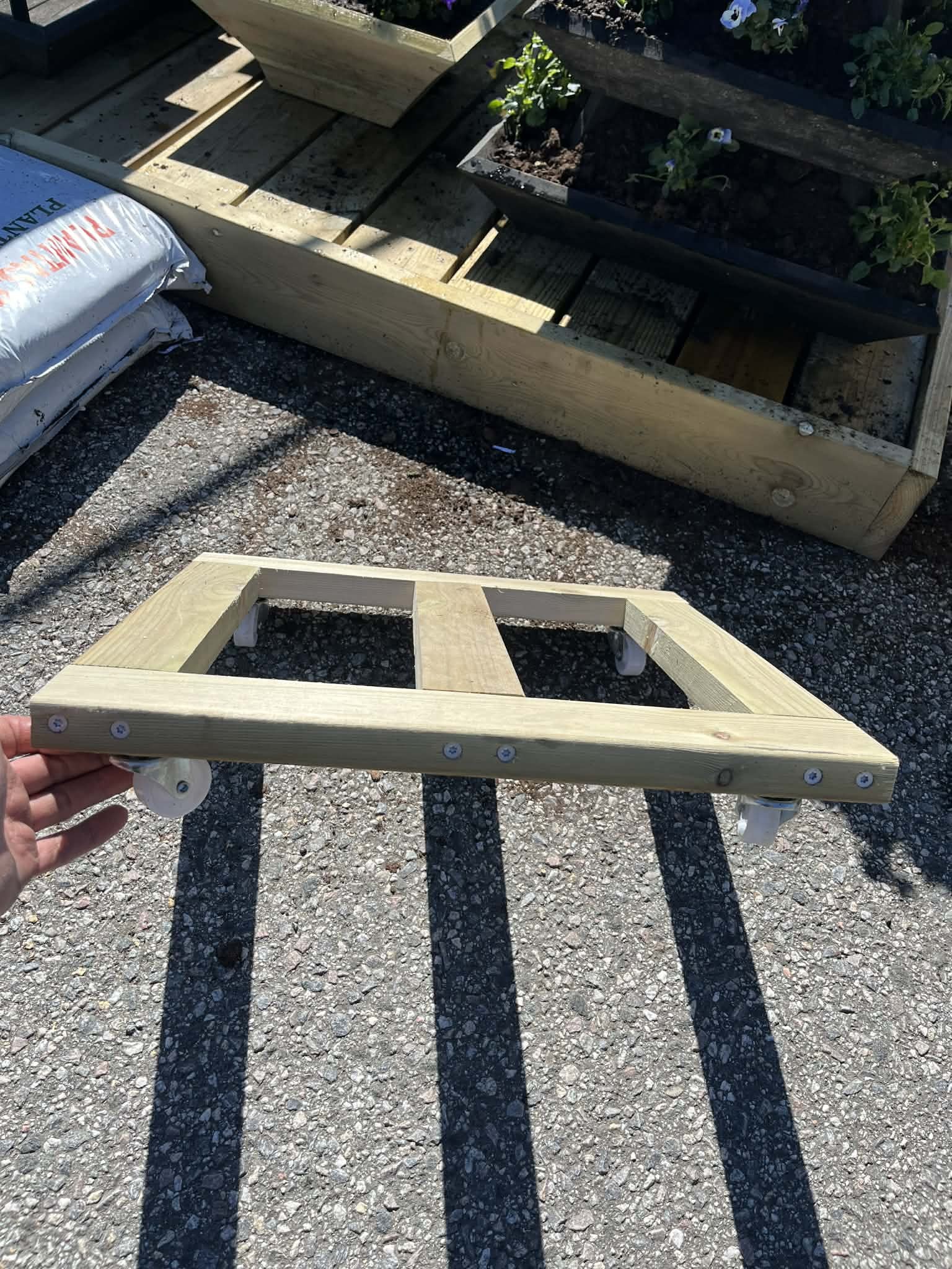 Blomekassa er laga i solid CU-impregnert materiale, som toler det norske klimaet og gir lang levetid. Ho er kledd med fiberduk i botnen for å hindre at jorda renn ut.